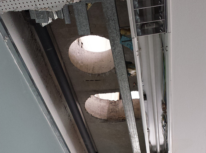 Bohrungen für die Lüftungsanlage überhalb eines Schulungsraumes
