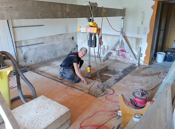 ... mittels Portalkran und E-Kettenzug (Fußboden musste nicht erhalten bleiben)