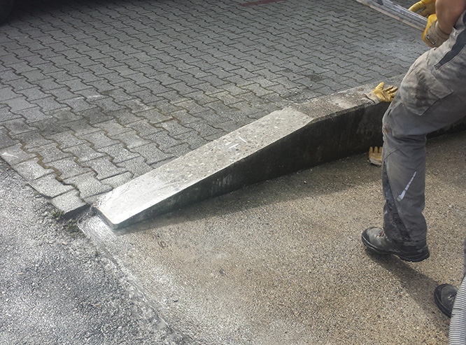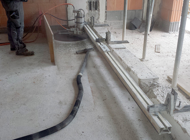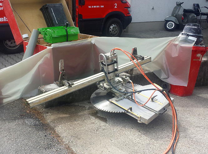 Herstellen von Öffnungen und Schlitzen in beliebiger Form, auch Schrägschnitte bis 45º für Türleibungen in Wänden, Beton, Stahlbeton und Mauerwerk. Überstehende Betonteile können auch wandbündig geschnitten werden.